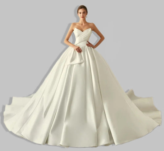 Elegant Satin A-Line Wedding Dress with Bow Detail and Dramatic Train