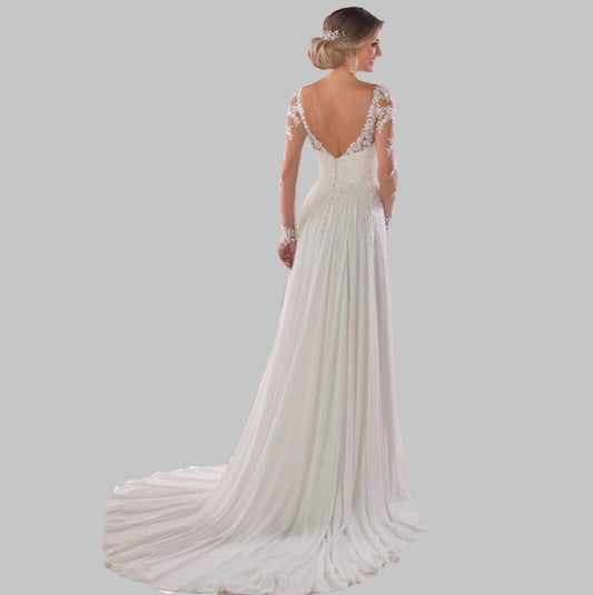 Beach Wedding Dresses A-Line V Neck Long Sleeve Court Train Chiffon Bridal Gowns With Lace