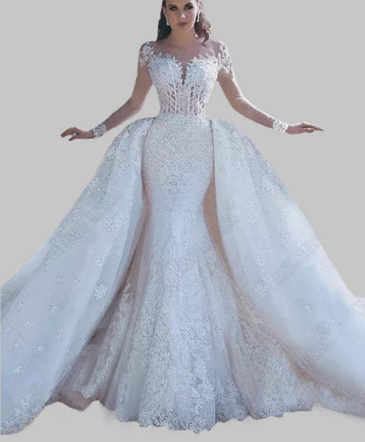 Chic Long Sleeve Lace Wedding Dress with Deep V-Neck and Mermaid Train