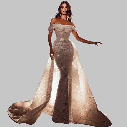 Elegant Off-Shoulder Sparkling Mermaid Evening Dress with Train