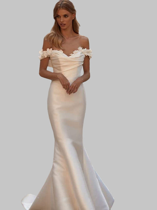 Elegant Off-Shoulder Satin Bridal Gown with Attachable Train