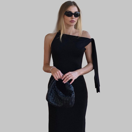 Elegant One-Shoulder Black Maxi Dress with Flowing Detail