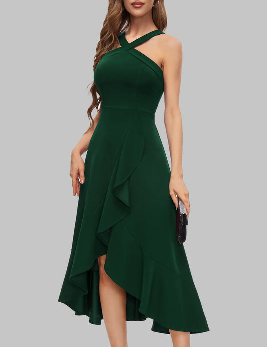 Elegant Red A-Line Midi Dress with Spaghetti Straps and Ruffle Hem