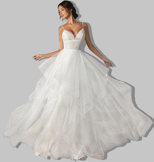 Women Tiered Tulle Wedding Dresses Slip Dresses V Neck with Adjustable Strap,Sexy Beach Dresses