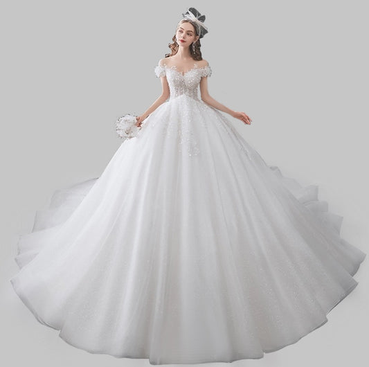 Off-Shoulder Ball Gown Wedding Princess Dress with Lace and Bead Embellishments